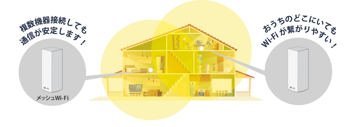 メッシュWi-Fiは、複数の機器を設置しても、中継機とは異なりひとつのSSIDでご家庭内全体でWi-Fiをご利用いただくことができ、スマートフォンやPCの利用場所を変更した場合にも、電波環境の良いメッシュWi-Fi対応ルーターと自動接続されるため、安定したインターネット環境の構築を実現します。*