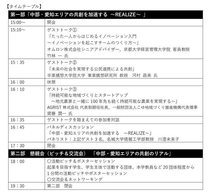 テーマは「中部・愛知エリアの共創を加速する~REALIZE~」。全国の共創のトップランナーを招いたゲストトークとパネルディスカッション、本学や中部・愛知エリアの若者や大学を中心とした共創・イノベーションプロジェクトのピッチ(プレゼンテーション)を行います。時代の変化の捉え方、実践している共創、未来について、ヒントが得られる貴重な機会で、どなたでも参加可能です。