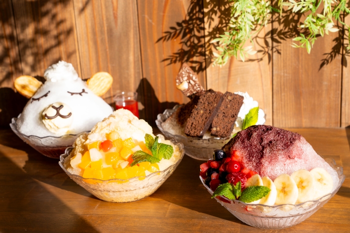 「カフェ・スコーラ」では、暑い夏にぴったりなかき氷4種類を用意。黄桃やさくらんぼ、ブドウ等のフルーツをトッピングした「食べるミックスジュース」や、濃厚なチョコレートソースと冷たい氷に、日替わりでブラウニーもしくはチョコレートクッキーをトッピングした「チョコレートかき氷」、また昨年も大好評をいただいた「アサイーかき氷」、のじま動物園の人気者 アルパカ「ラアル」がかき氷になった「アルパかき氷」も登場。ラアルのもこもこで白い姿を表したふわふわのかき氷に自家製いちごソースをかけて、自然な甘さと果肉感をお楽しみいただけます。
