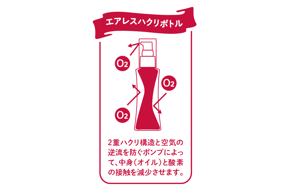 酸化したオイルは肌への刺激が高まります。そこで『アラウ.ベビー ベビーオイル』は、赤ちゃんの肌へのやさしさを考えて、植物性オイルでありながら酸化しにくい独自処方を実現。また、ベビーオイルでは初のエアレスハクリボトルを採用しています。エアレスハクリボトルは、2重ハクリ構造と空気の逆流を防ぐポンプによって、中身(オイル)と酸素の接触を減少させることでオイルを酸化しにくい状態に保つので、最後まで安心してフレッシュなオイルをお使いいただけます。