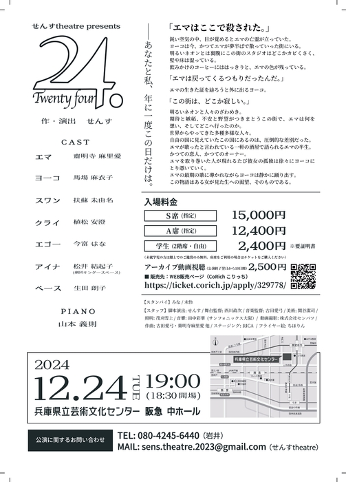 せんすtheatre presents「24.」が2024年12月24日 (火)に兵庫県立芸術文化センター(兵庫県 西宮市 高松町 2-22)にて上演されます。