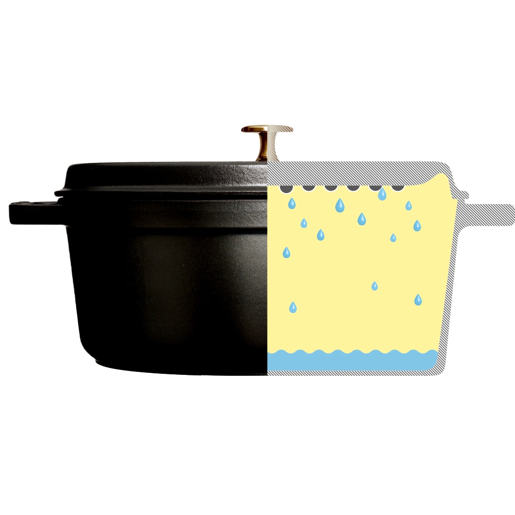 鍋本体・蓋ともに厚みのある鋳鉄製。食材をムラなく優しく加熱し、食材の旨みを含む水分は蒸気となって鍋の中に充満。そして、蒸気は蓋裏の突起「ピコ」や「システラ」を介して、旨みを含んだ水滴となって再び食材へと戻ります。旨みを閉じ込めて仕上げるストウブ独自の仕組み「アロマ・レイン」により、野菜は甘さが引き立ち、お肉も柔らかくジューシーに。出汁を加えなくても、滋味深い味わいが鍋まかせで完成します。