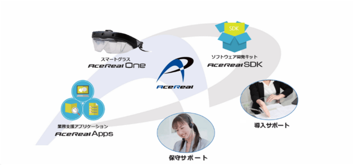 「AceReal」はサン電子が自社開発している「AceReal One」(ARスマートグラス)、「AceReal Apps」(クラウド型業務支援アプリケーション)、「AceReal SDK」(ソフトウェア開発キット)をワンストップで提供するトータルソリューションです。