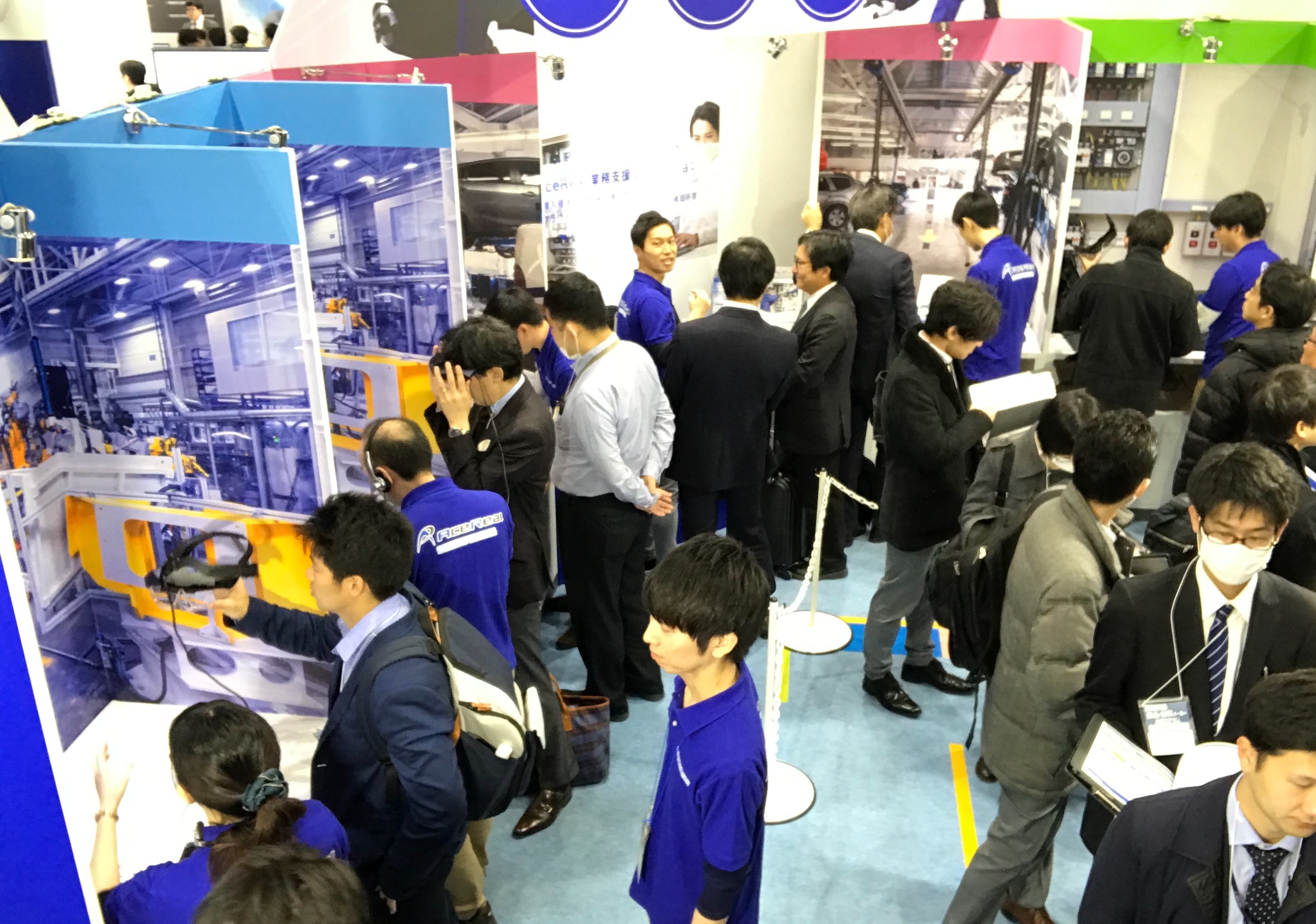 ブース内側では「業務支援アプリケーションデモ体験 写真(2)」を展示し、3日間を通して約1,100名の方々にご体験いただくことができました。業務支援アプリケーションのデモ内容は、チェックリストに沿って作業内容の説明動画を確認し、点検作業中にビデオチャットを使用し遠隔地にいる支援者から指示を受けたり、作業終了後に作業結果の記録を写真で残したり、実際の作業現場におけるAceReal Oneの活用シーンを体験いただくといったものでした。