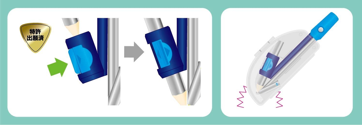 特許出願済みの新機能は、紙に押し付けると針を覆うガードパイプが引っ込み、針が出る仕組み。使わない時は針がかくれてとっても安全です。
