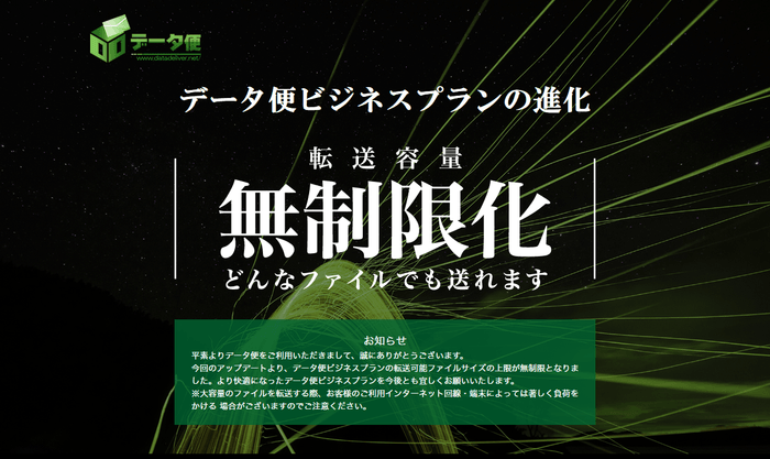 「データ便」、ビジネスプランの送信ファイル容量を無制限化 100GB超えのファイルでも簡単に送信!