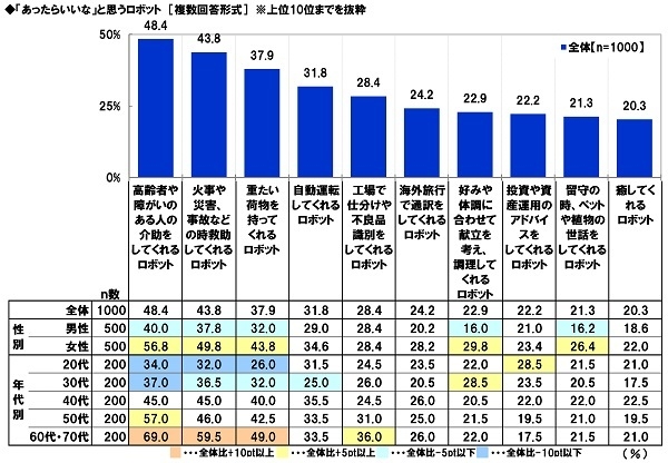 そこで、全回答者(1,000名)に、「あったらいいな」と思うロボットについて聞いたところ、1位は「高齢者や障がいのある人の介助をしてくれるロボット」(48.4%)となりました。来るべき高齢化社会に向けて、こうしたロボットの必要性がますます高まっていくでしょう。次いで2位「火事や災害、事故などの時救助してくれるロボット」(43.8%)、3位「重たい荷物を持ってくれるロボット」(37.9%)、4位「自動運転してくれるロボット」(31.8%)、5位「工場で仕分けや不良品識別をしてくれるロボット」(28.4%)と続きました。人間以上の力を発揮して、人間の手助けをする実用的なロボットを望む声が多いようです。