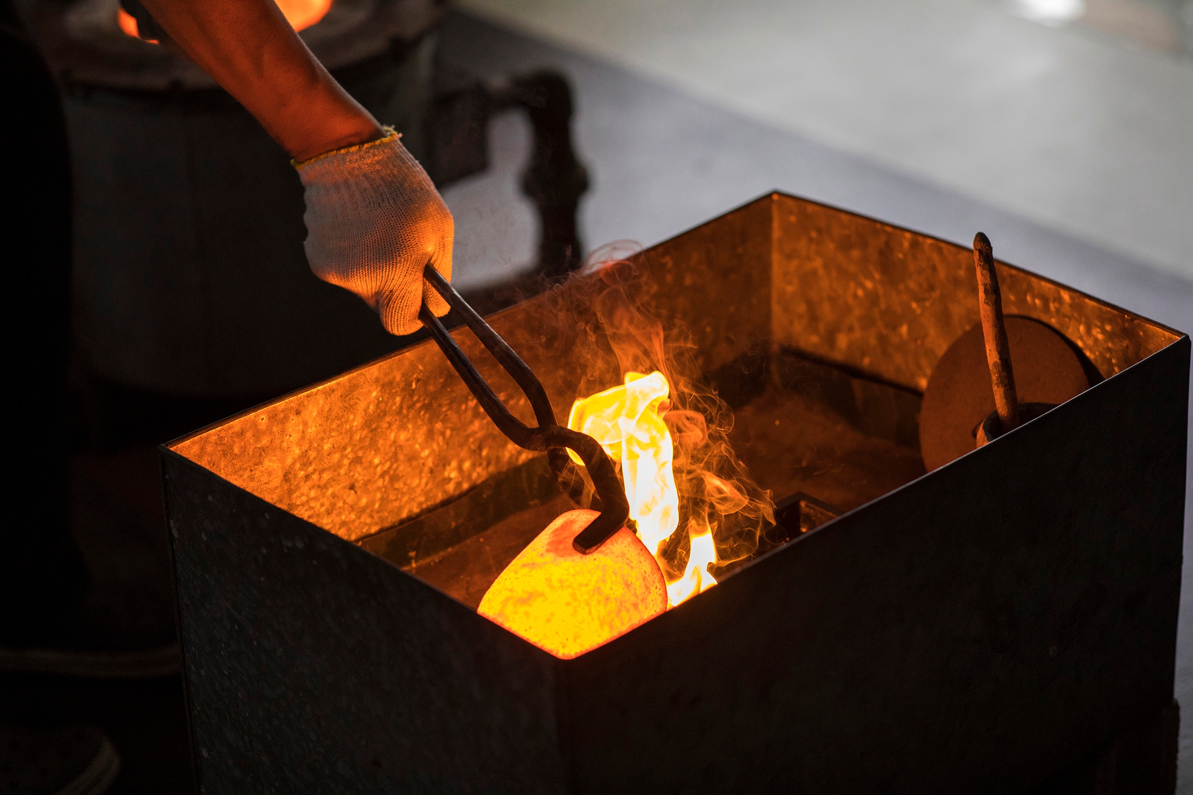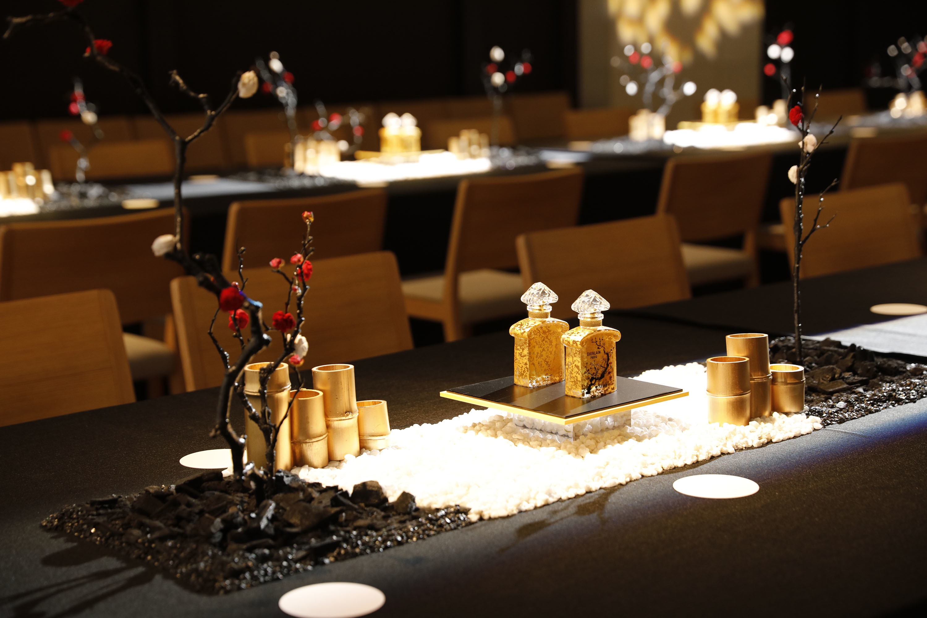 この記念ボトルの装飾は、ミツコのコンセプトとなっている「日本女性らしさ」「美しさ」「芯の強さ」を表現したいという依頼で箔一に委ねられました。1年以上かけ、ゲランの想いを具現化した表現がどのようなものか探りながら、サンプルのやり取りを繰り返しました。試行錯誤の結果生まれたのが、独創性を表現したこの記念ボトルとなったのです。ボトルには箔一の職人が「散らし」と呼ばれる技法を用いて、一つずつ手作業により装飾しています。金箔は23.5カラット。熟練の伝統工芸士が時間をかけて丁寧に作り上げた素材を用いています。手作業で舞い散る金箔をボトルに施すため、それぞれの作品には唯一無二の魅力が備わっています。豪華な金箔装飾の上からは、カリグラフィーデザイナーである中塚翠涛が描く紅白梅が描かれており、ミツコの控えめながら情熱的な美しさが表現されています。