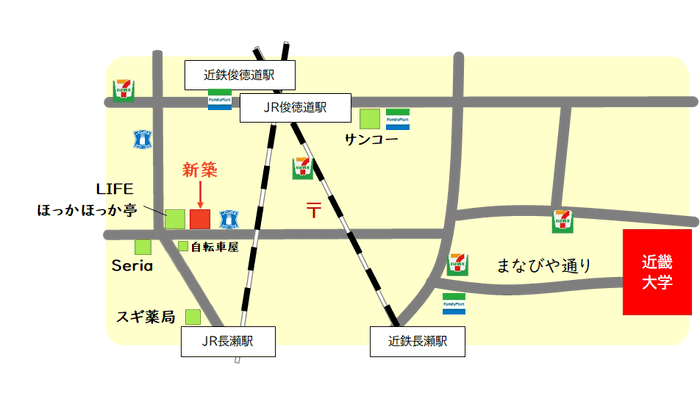 徒歩1分でスーパー・コンビニがある好立地。大学までは自転車で6分。新大阪まで1本(乗車時間31分)、近鉄難波駅までは乗り換え1回(27分)ですので、就活や帰省、アルバイトにも便利です。
