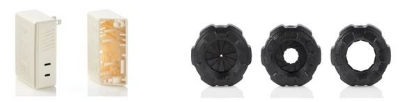 F123シリーズで造形した「電気プラグ」(左)と「カメラのシャッター」(右)。複雑な形状もソリュブルサポートで簡単にサポート除去が可能。