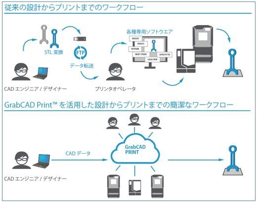 「GrabCAD Print(TM)」は設計からプリントまでを網羅したユニバーサルアプリケーションです。「GrabCAD Print(TM)」を使用することで、従来は必須だったCADデータからSTLデータへの変換が不要となり、CADデータから直接プリントすることが可能となりました。