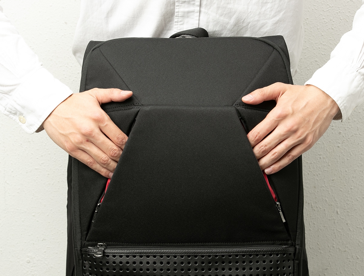 「ひらくPCリュック」の中身は、二等辺三角形という特殊な構造をしています。その理由は2つ。