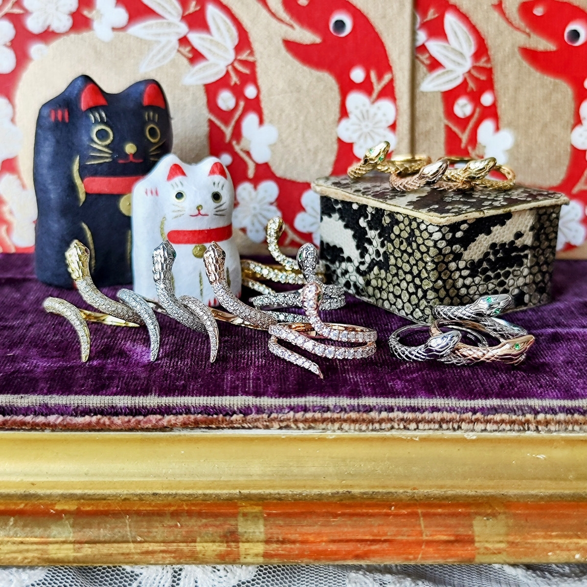 とぐろを巻く姿は「終わりのない愛」を表し、また「金運」を運ぶ縁起の良い存在としても知られています。さらに、脱皮を繰り返す蛇は「再生」や「不死」を意味し、幸運を呼び込むシンボルとして、多くのジュエリーデザインに取り入れられています。