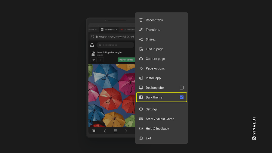 ダークモードがお好きな方向けに、任意のウェブページをダークテーマで閲覧できるようになりました。[設定]>[テーマ]>[ウェブページ用ダークモード] を有効にすると、Vivaldiメニュー内に[ダークテーマ]に切り替えるボタンが表示されます。
