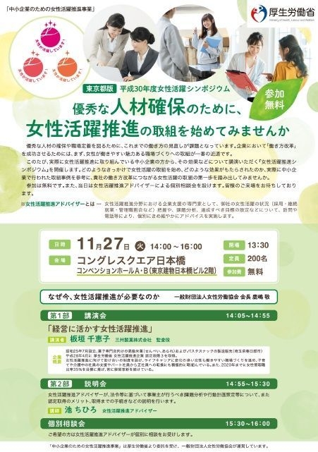 厚労省委託事業 中小企業の経営者・人事労務担当者向け 『女性活躍推進シンポジウム』11月27日(火)東京にて開催