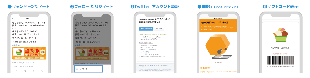 『dgiftSNS』Twitter版では、フォロー&リツイートやハッシュタグツイートなど、特定の条件を達成したユーザーに対してデジタルギフトを付与するキャンペーンが実施できます。