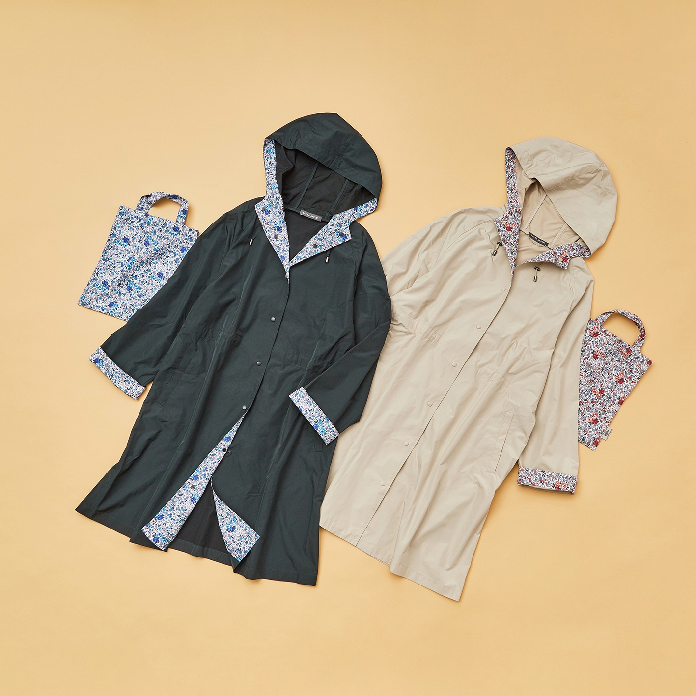 新作のレインコートは、水をはじく撥水加工に加え、強い雨でも安心な防水加工を施した生地を使った機能的にも優れたアイテム。