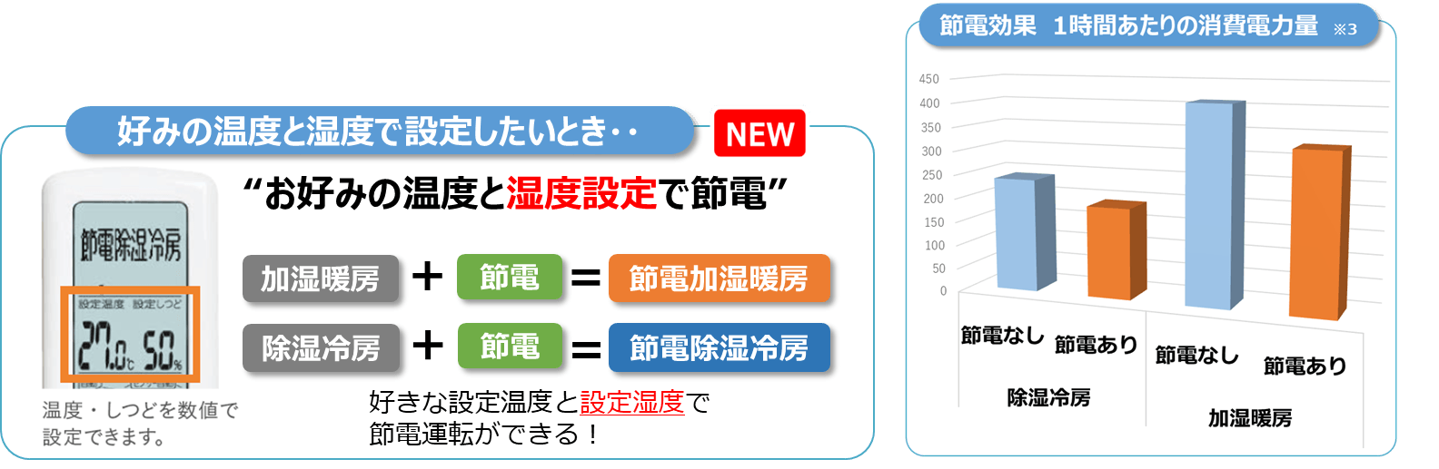 温度に加え最適な除湿モードで湿度を制御しながら節電する「節電除湿冷房」運転