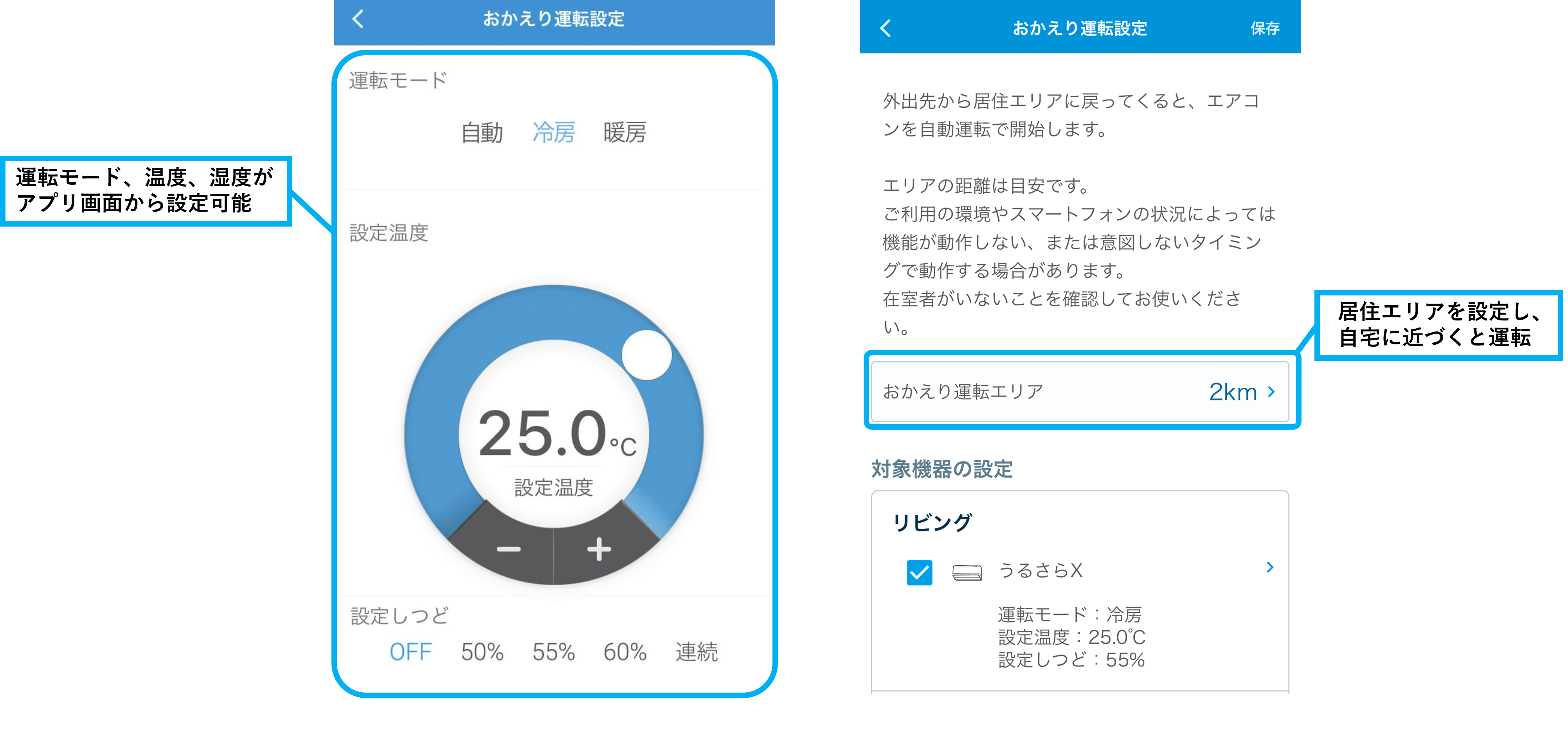 ・帰宅前に、予めアプリでお好みの温度と湿度に設定しておくことで、自宅に近づくと自動でエアコンが運転。お好みの温湿度で快適になったお部屋に帰ることができます(※自動運転での「おかえり運転」設定は、湿度のみが設定可能となります)。