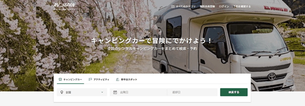 キャンピングカージャパンとは、キャンピングカー・車中泊スポット・アクティビティ等をインターネット上で予約することができる総合キャンプ・アウトドア予約プラットフォームです。中でもキャンピングカープラットフォームは日本最大級の取扱車両数を誇り、全国各地のキャンピングカーを比較検索することが可能です。
