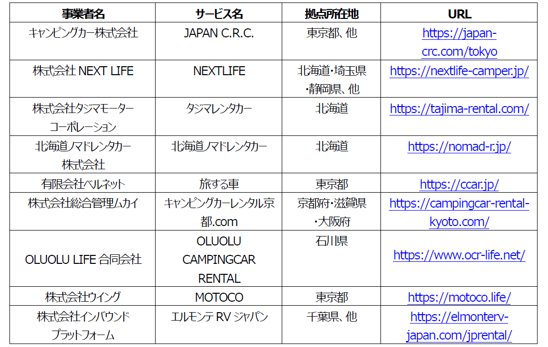 キャンピングカージャパンにおいて、下記の事業者に参画いただき、現在約100台のレンタルキャンピングカーをご登録いただいております。
