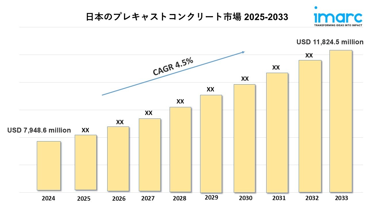 IMARCグループの最新の研究発表によると、「日本プレキャストコンクリート市場レポート:タイプ別(床・屋根、柱・梁、階段・踊り場、壁)、製品別(構造建築部材、建築設計部材、輸送用製品、水処理・廃棄物処理製品、その他)、最終用途別(住宅用、非住宅用)、地域別(2025~2033年)」2024年、日本のプレキャストコンクリート市場規模は79億4,860万米ドルに達しました。今後、IMARCグループは、市場規模が2033年までに118億2,450万米ドルに達し、2025年から2033年の間に年平均成長率(CAGR)4.5%を示すと予測しています。