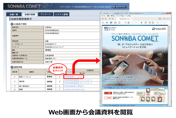 SONOBA COMETでは、サーバに登録した会議資料はファイルサーバへ直接アクセスして閲覧していましたが、SONOBA Webサーバ上で資料の閲覧が可能となりました。その為、Webブラウザ上の会議情報画面から会議資料をクリックすることで閲覧が可能となりました。
