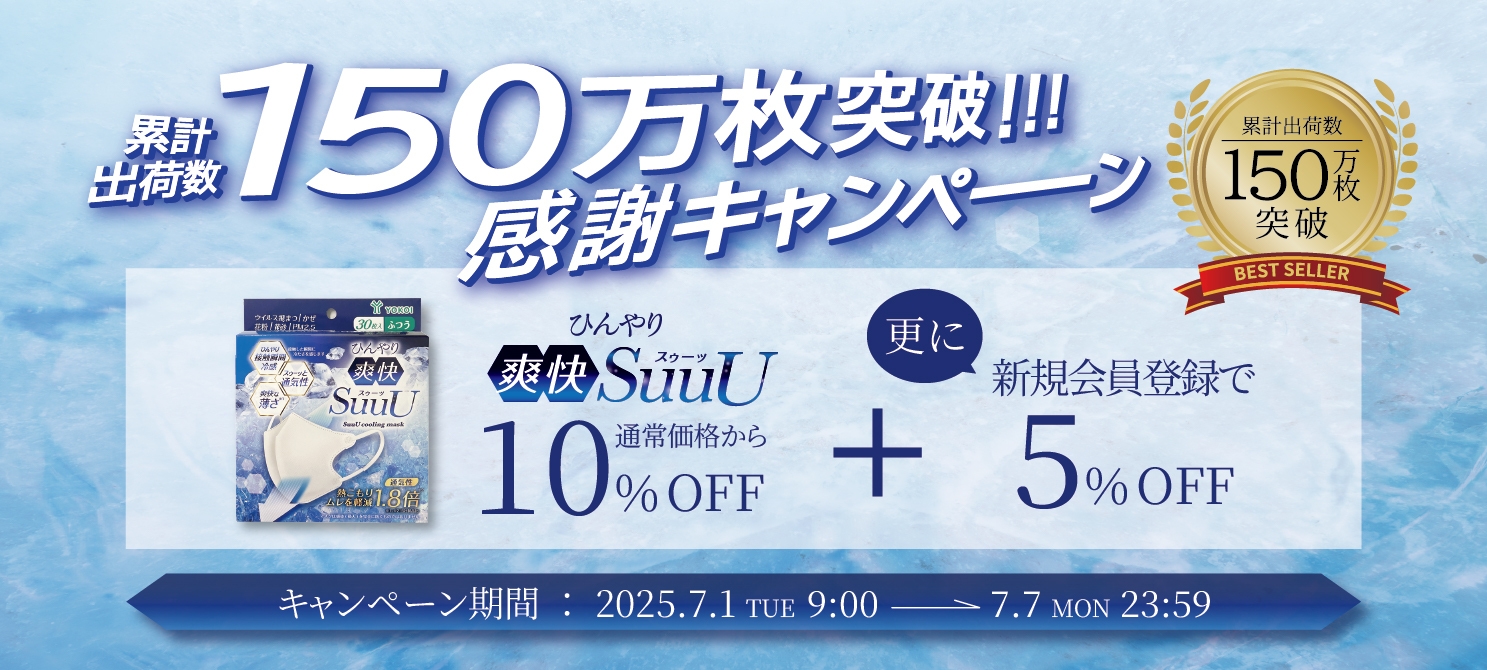今回、150万枚達成を記念して、2025年7月1日(火)~7日(月)までの期間、ヨコイオンラインショップにて、最大15%オフで「ひんやり爽快SuuU」をお試しいただけるキャンペーンを実施いたします。