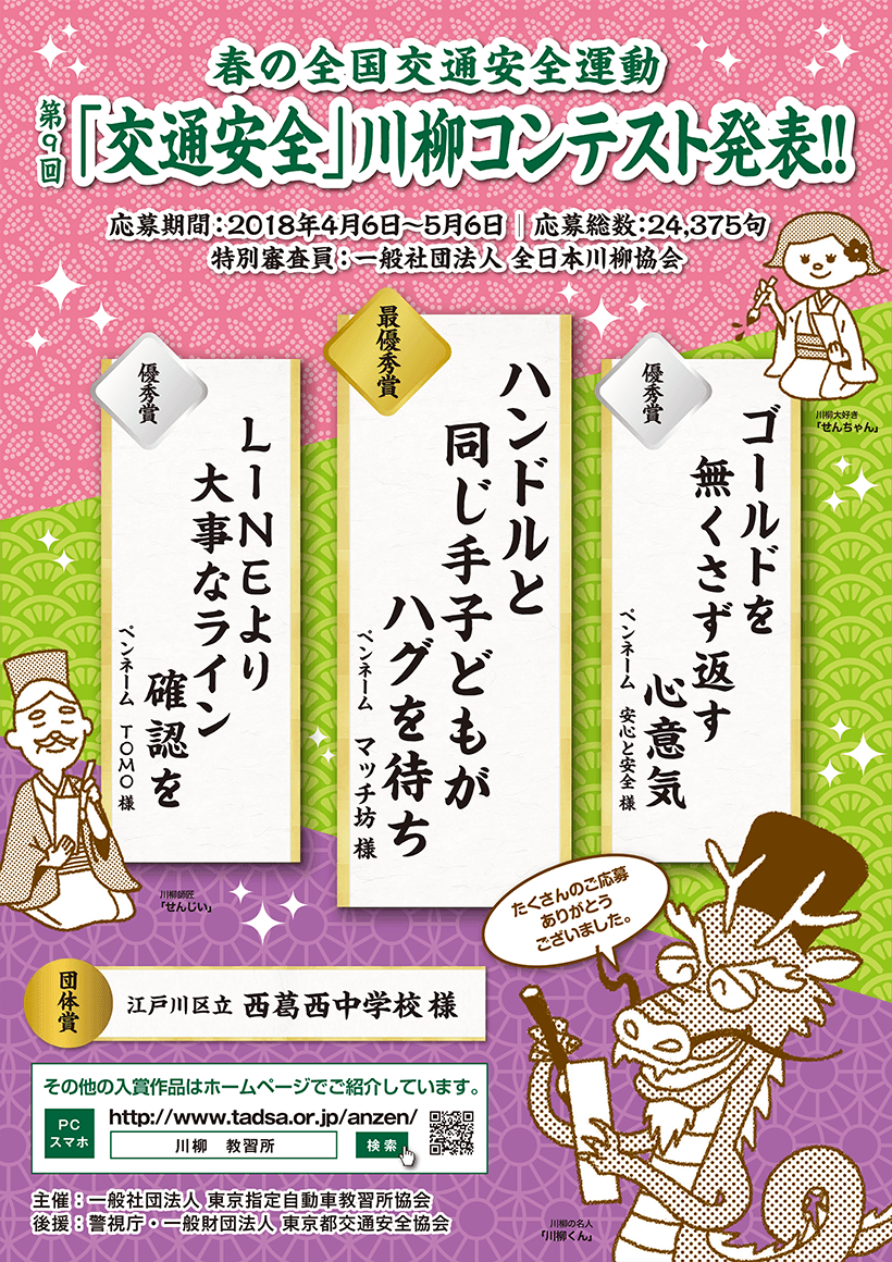 一般社団法人 東京指定自動車教習所協会(本部:東京都品川区、以下 東京指定自動車教習所協会)は、警視庁、一般財団法人 東京都交通安全協会の後援を受け、4月6日(金)から5月6日(日)まで開催した、第9回「交通安全」川柳コンテストの入賞作品を、6月25日(月)に発表いたしましたので、お知らせします。