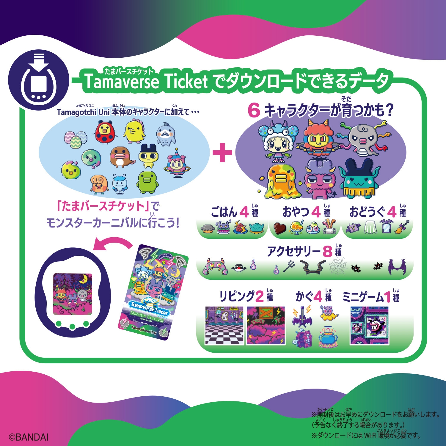 『Tamagotchi Uni』をお持ちのお客様は、『Tamaverse Ticket Angel Festival』や『Tamaverse Ticket Monster Carnival』をオンラインまたは店頭でご購入いただくことで、データをダウンロードすることができます。