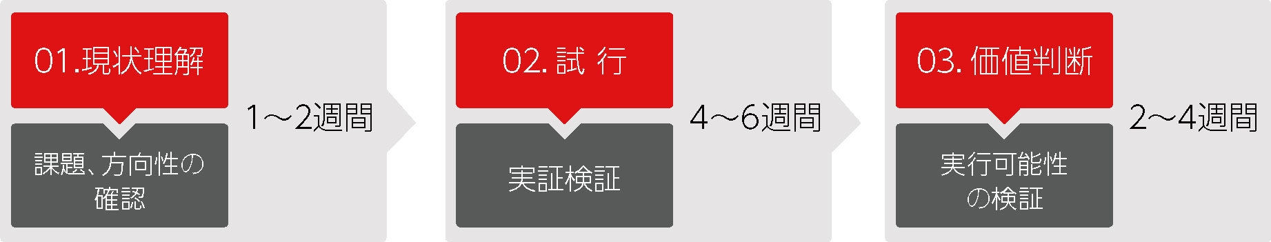 経営課題への戦略的取組みや未経験領域の施策などに対し、ICTで支援できることを最短2カ月で価値実証(=PoV:Proof of Value)します。「tdi Competency Lab」のPoVのプロセスでは、お客様の経営課題の現状理解から、試行(=PoC:Proof Of Concept)、そして価値判断をおこないます。意思決定を迅速にするために、PoCには「アジャイル型」を採用しています。
