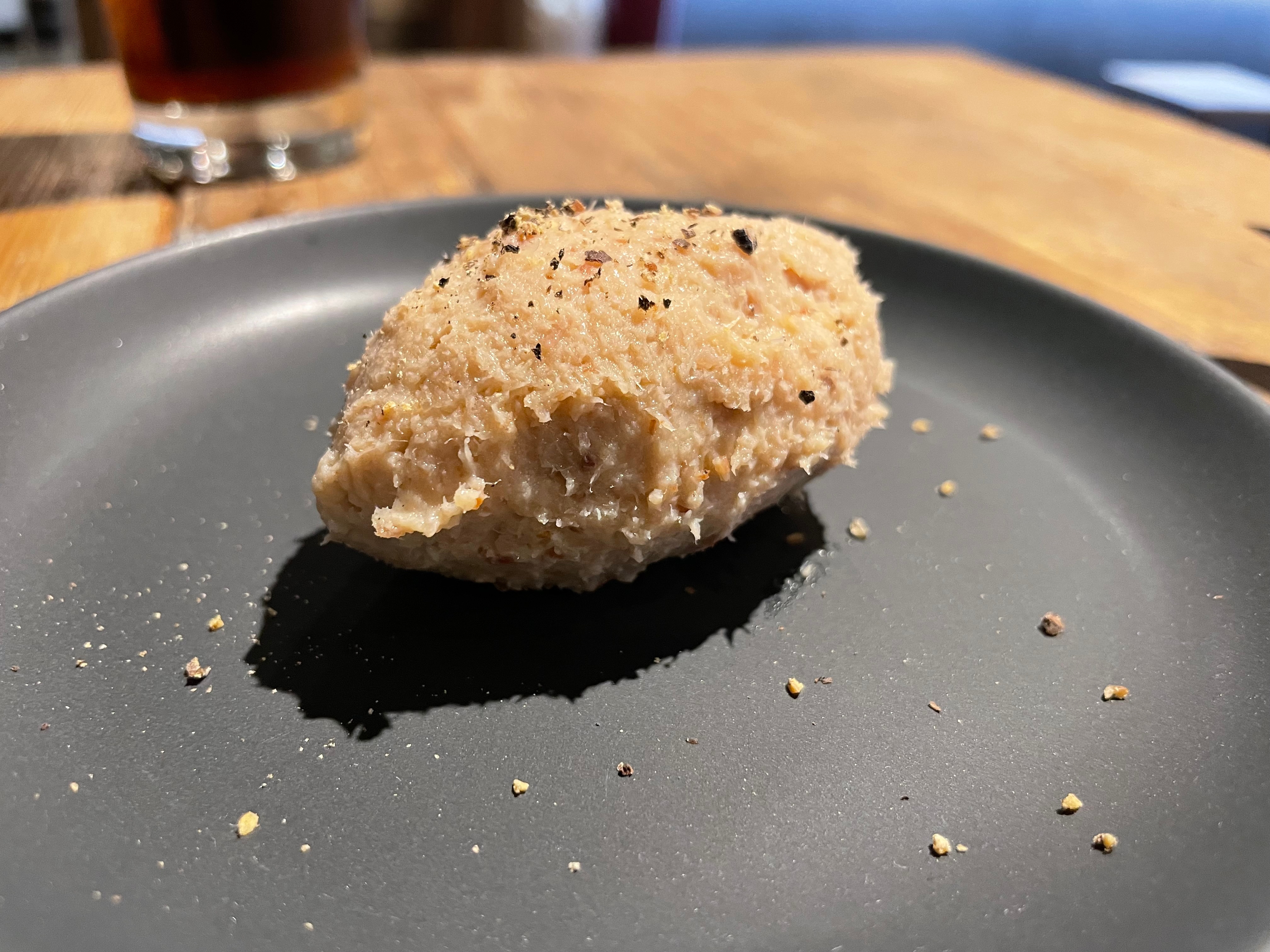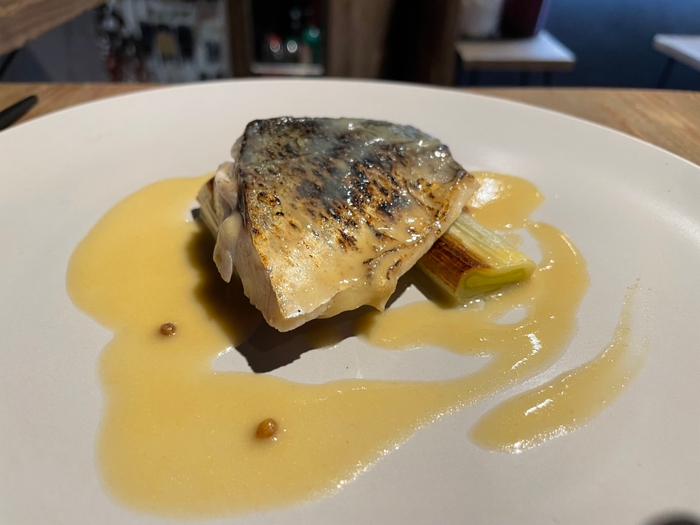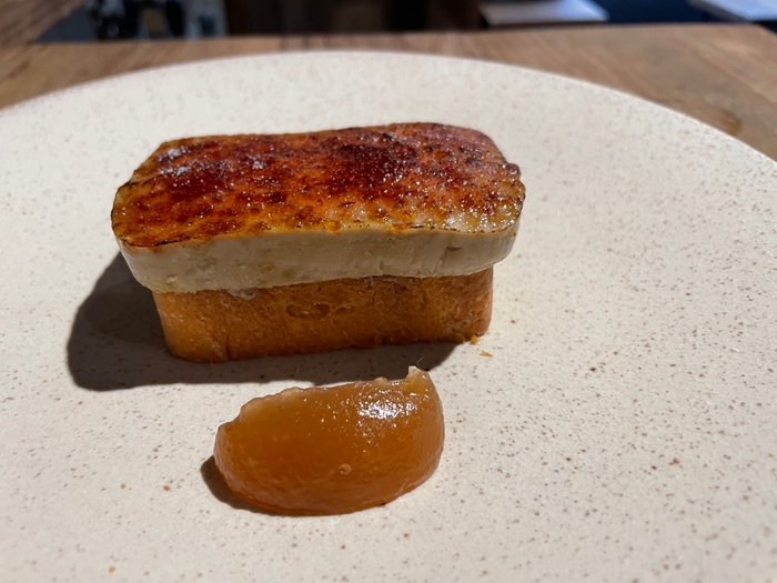 白味噌と白ワインソースでフレンチ仕立てに仕上げました。バタートッピングがおすすめ。バターたっぷりの自家製ブリオッシュとレバーパテ(¥650)