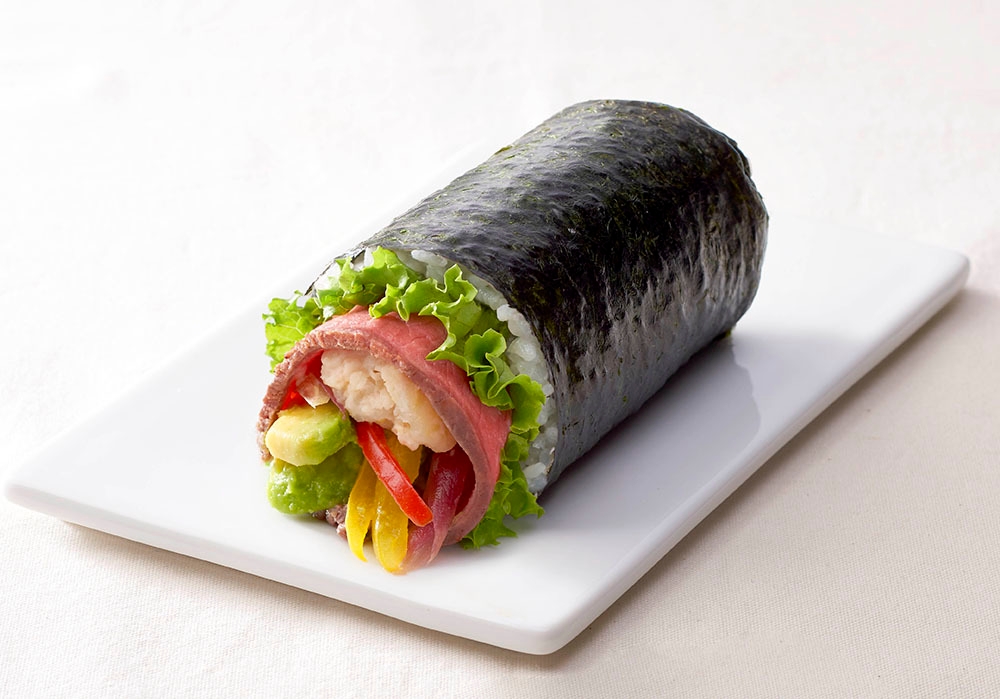 中でも初登場の『ローストビーフ巻』は、肉の旨みを凝縮したローストビーフとパプリカやアボカドなどの色鮮やかな野菜を一緒に巻いた、女性に嬉しい恵方巻です。同じく初登場の『牛ヒレカツ巻』は、店舗でサクサクに揚げた牛ヒレカツにタルタルソースと醤油タレで味付けをして巻いた、食べ応えのある一品です。その他、毎年好評の『黒毛和牛 ステーキ巻』や『京都産九条葱と黒毛和牛 すき焼 恵方巻』など、お肉が主役の恵方巻が充実しています。