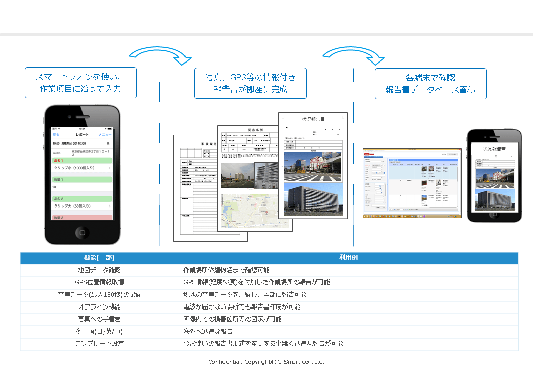 現場からの報告データは、テキスト(文字/数字)や写真、音声、GPS等多くの情報が取得でき、報告書の帳票レイアウトも自由自在で幅広い業務に対応。Web APIを利用した基幹システムでのデータ連携や、報告情報をCSV/Excel/PDFに出力して、顧客への速やかな報告書提出や各種分析、マーケティングにも活用可能。2010年のリリース以来、顧客視点での機能追加とバージョンアップを繰り返し、多くの顧客に支持されている。