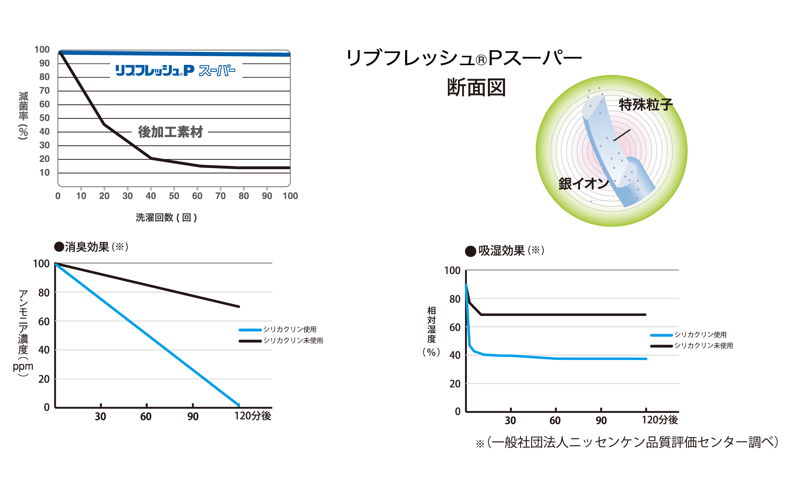※3 消臭・湿度調整効果、菌の増殖抑制効果については下記図表を参照ください(一般社団法人ニッセンケン品質評価センター調べ)