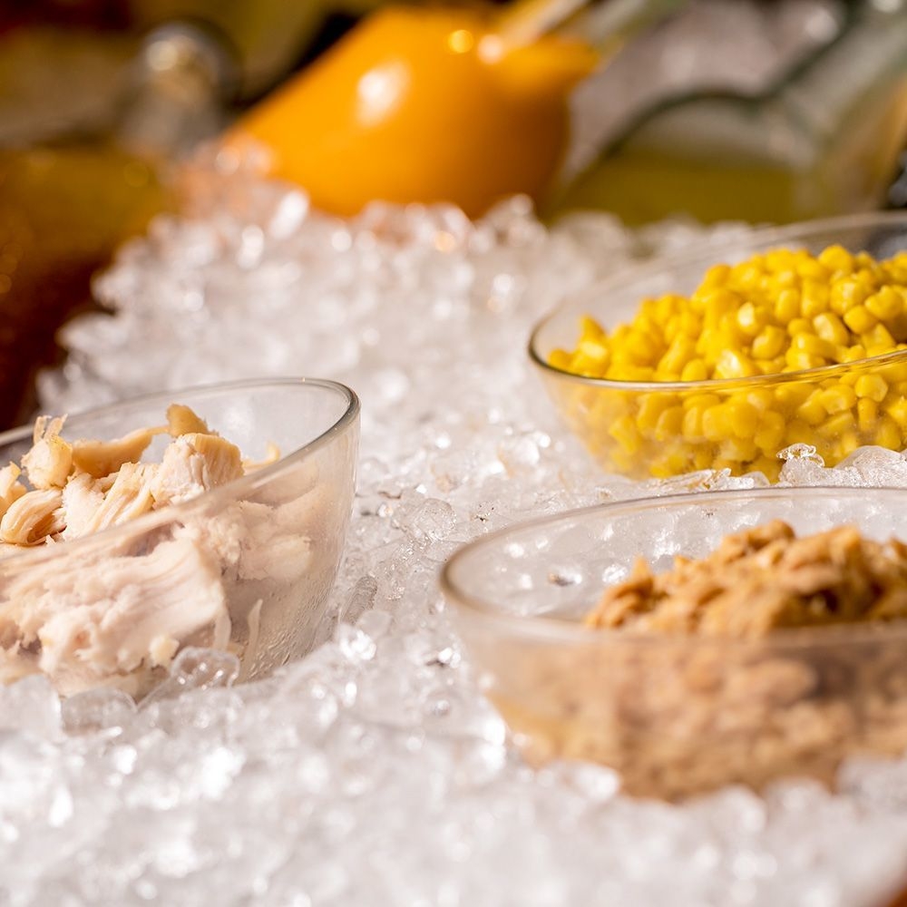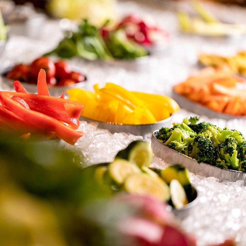 サラダバー・燻製カレー・ライス・スープ・ドリンクバーが食べ飲み放題でお楽しみいただけます。サラダバーは、ディナータイムで女性に人気の高い「素材マーケット」の新鮮野菜を13~20種類前後、ドレッシングはフルーツビネガー・シーザードレッシング・和風オニオンなど4~5種類ご用意。しっかり食べたい方向けに、牛・豚・鶏・魚の4種類の追加メニューもございます。