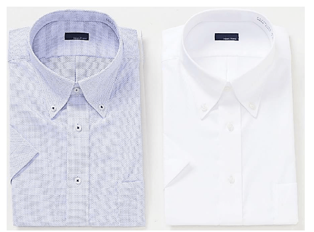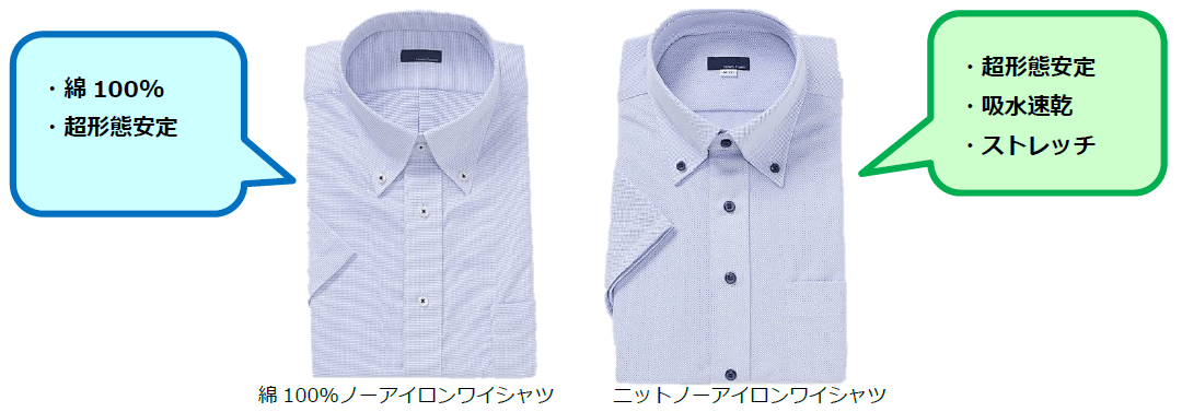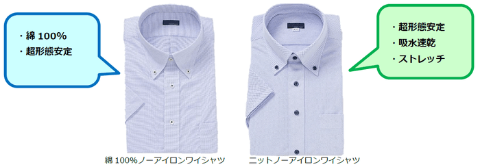 「超形態安定加工」を施し、洗濯後にアイロンをかける必要がなく毎日のお手入れが簡単な「ノーアイロン」のシャツです。「綿100%ノーアイロンワイシャツ」は綿100%のやわらかい肌触りで、防シワ性の高い特殊な生地を使用しているため、綿100%なのに洗濯後のアイロンが必要ありません。「ニットノーアイロンワイシャツ」はポリエステル100%のスポーツニット素材で、吸水速乾・ストレッチ性に優れ、ポロシャツ感覚で着られるのでテレワークにおすすめです。