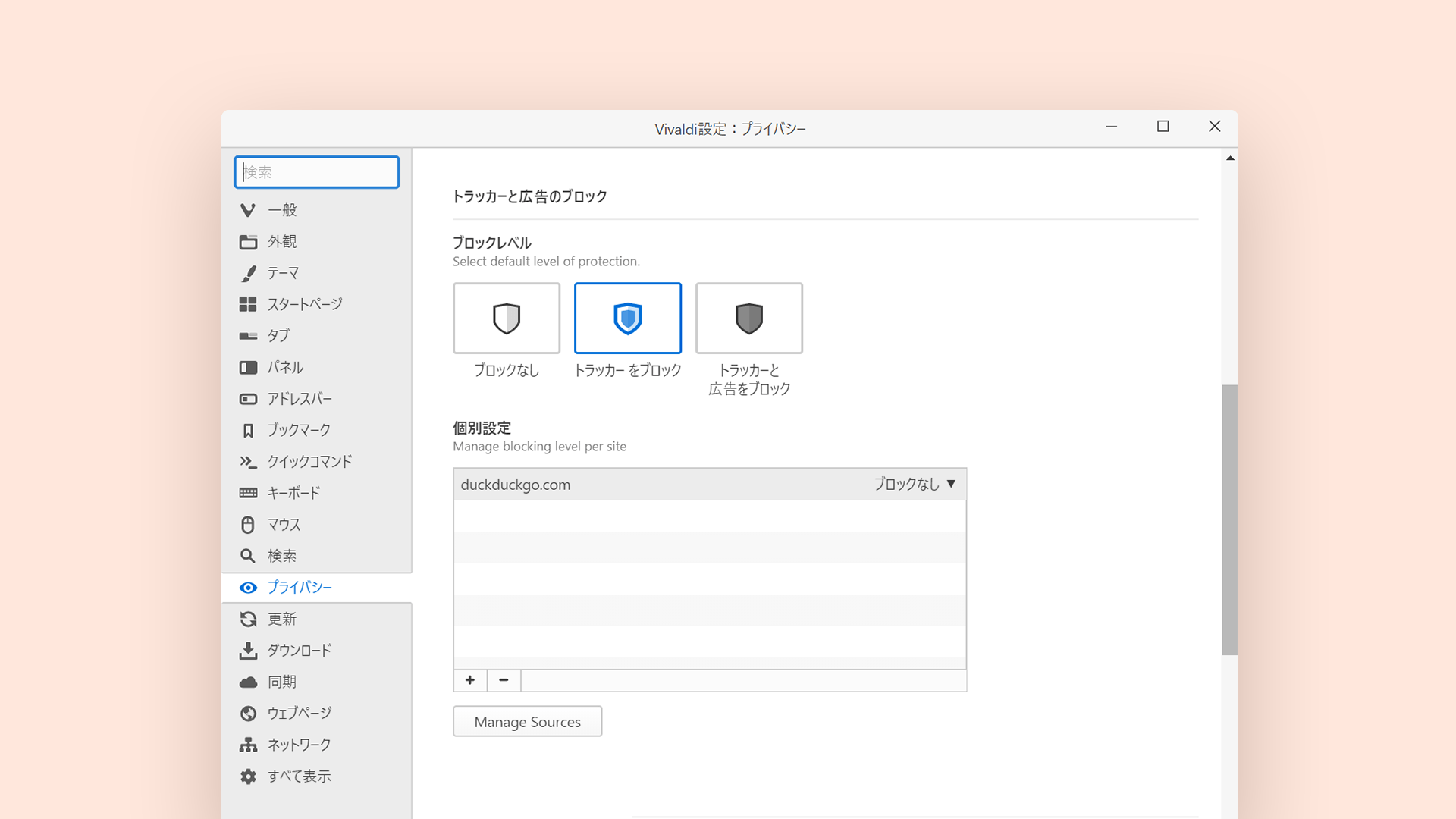 [ブロックなし]、[トラッカーをブロック]、[トラッカーと広告をブロック]の3種類のブロックレベルがあります。すべてのサイトで初期設定として利用するブロックレベルならびに、特定のウェブサイトごとの挙動を設定可能です。