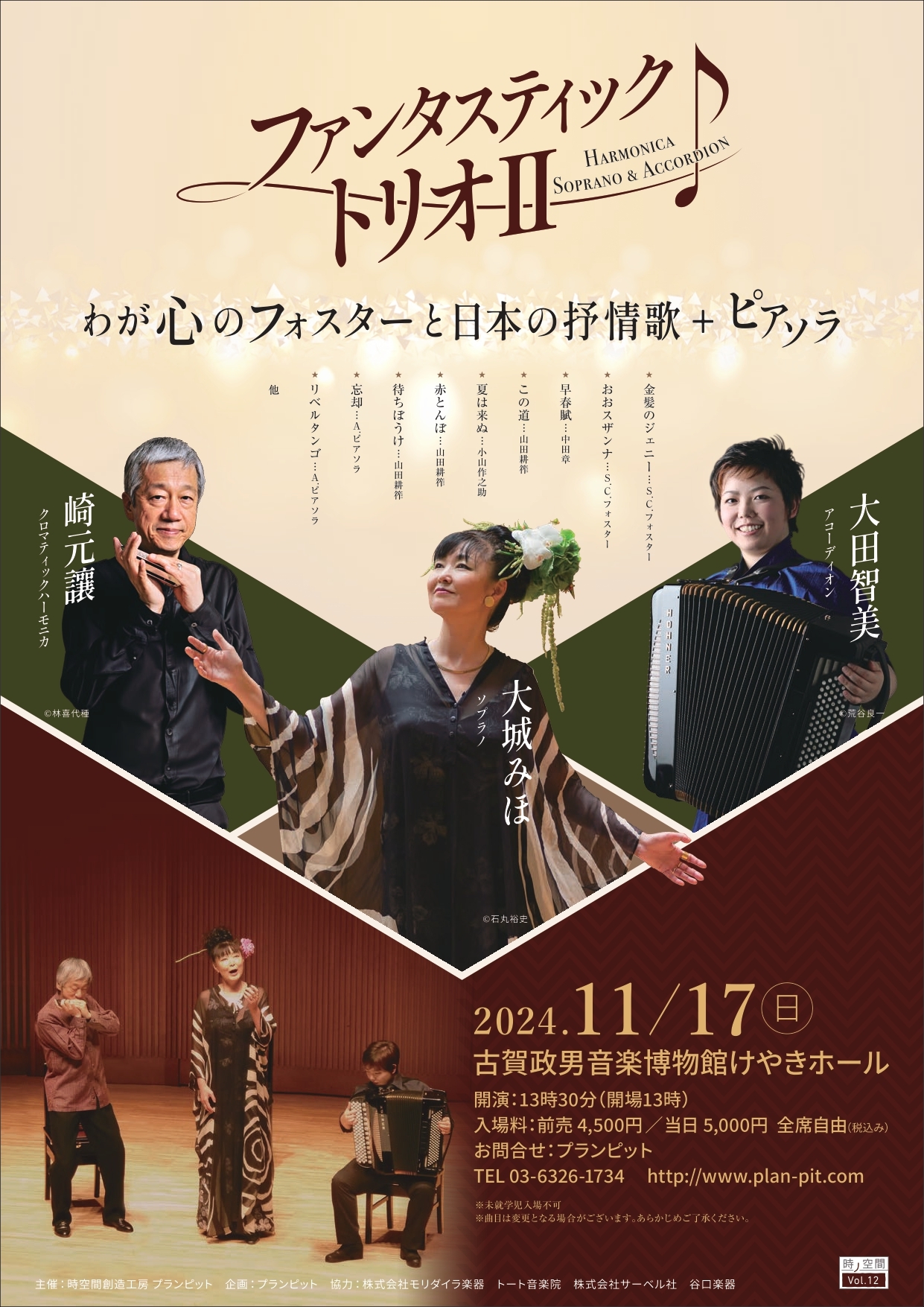 プランピット(代表:樋口義高)主催、『ファンタスティック・トリオⅡ~HARONICA・SOPRANO&ACCORDION』が2024年11月17日 (日)に古賀政男音楽博物館 けやきホール(東京都 渋谷区 上原 三丁目6-12)にて開催されます。チケットはカンフェティ(運営:ロングランプランニング株式会社、東京都新宿区、代表取締役:榑松 大剛)にて発売中です。