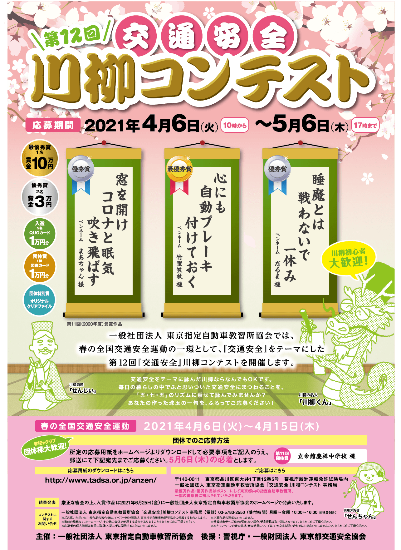 一般社団法人 東京指定自動車教習所協会(本部:東京都品川区、以下 東京指定自動車教習所協会)は、警視庁、一般財団法人 東京都交通安全協会の後援をいただき、2021年4月6日(火)より「春の全国交通安全運動」の一環として、交通安全にまつわることを詠んだ、第12回「交通安全」川柳コンテストを開催いたしますので、下記のとおりお知らせいたします。