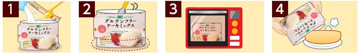 当商品は、袋の中に材料を入れて混ぜ、電子レンジで3分加熱するだけで簡単においしいグルテンフリーのケーキができる商品です。
