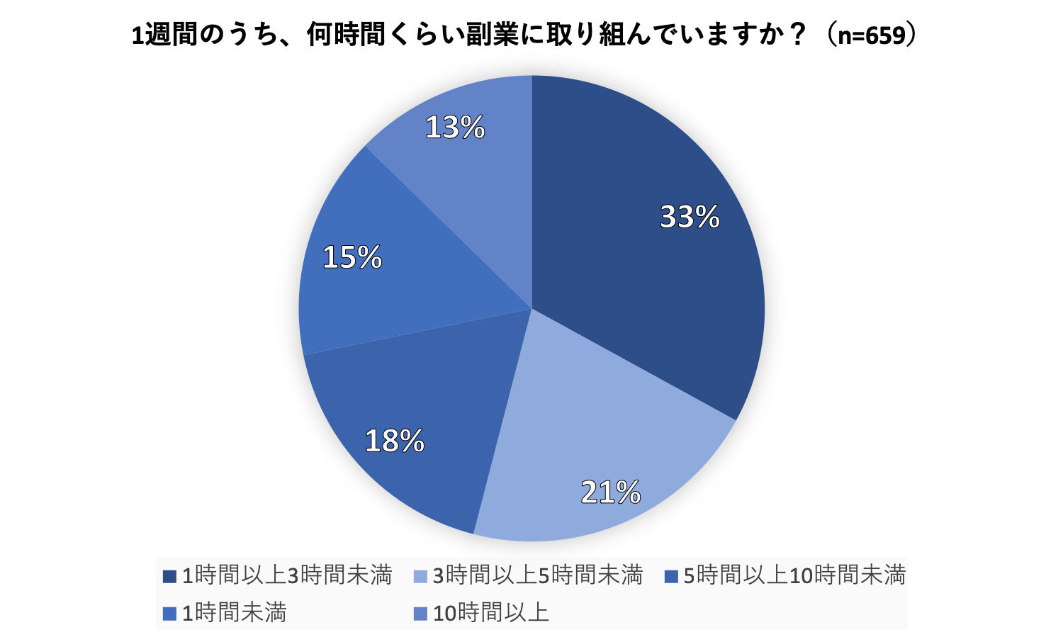 副業に取り組んでいる人を対象に、週にどれくらいの時間を副業にあてているかを伺ったところ、「1時間以上3時間未満(33%)」という回答がもっとも多く、次いで「3時間以上5時間未満(21%)」、「5時間以上10時間未満(18%)」という結果になっていました。