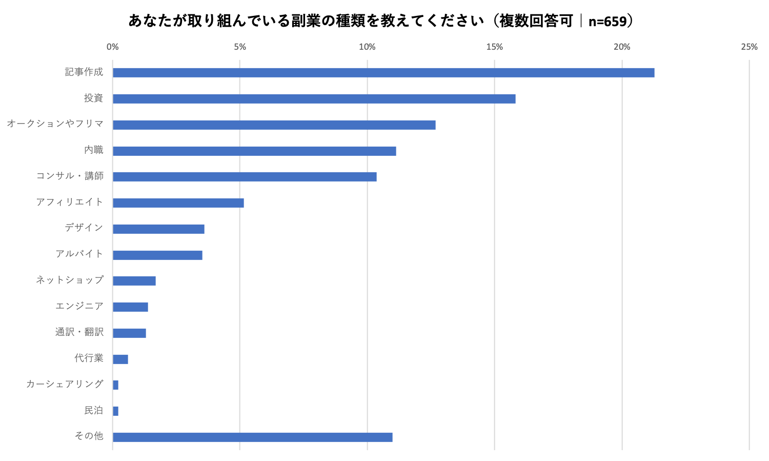 副業に取り組んでいる人を対象に、どんな副業に取り組んでいるかを伺ったところ、もっとも多かった回答が「記事作成(21%)」という回答でした。