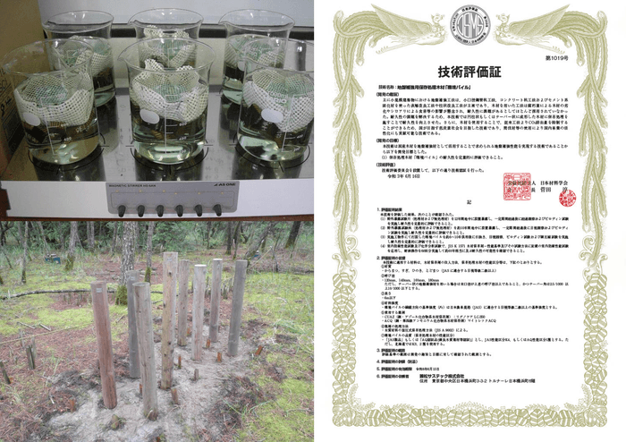 当社はこの耐久性の課題を解決するために、当社技術である木材保存処理技術を環境パイル(木材を利用した地盤補強材)に用いて耐久性を飛躍的に向上させその結果を第三者機関おいて証明を取得しました「木材の地中利用としては業界初」。