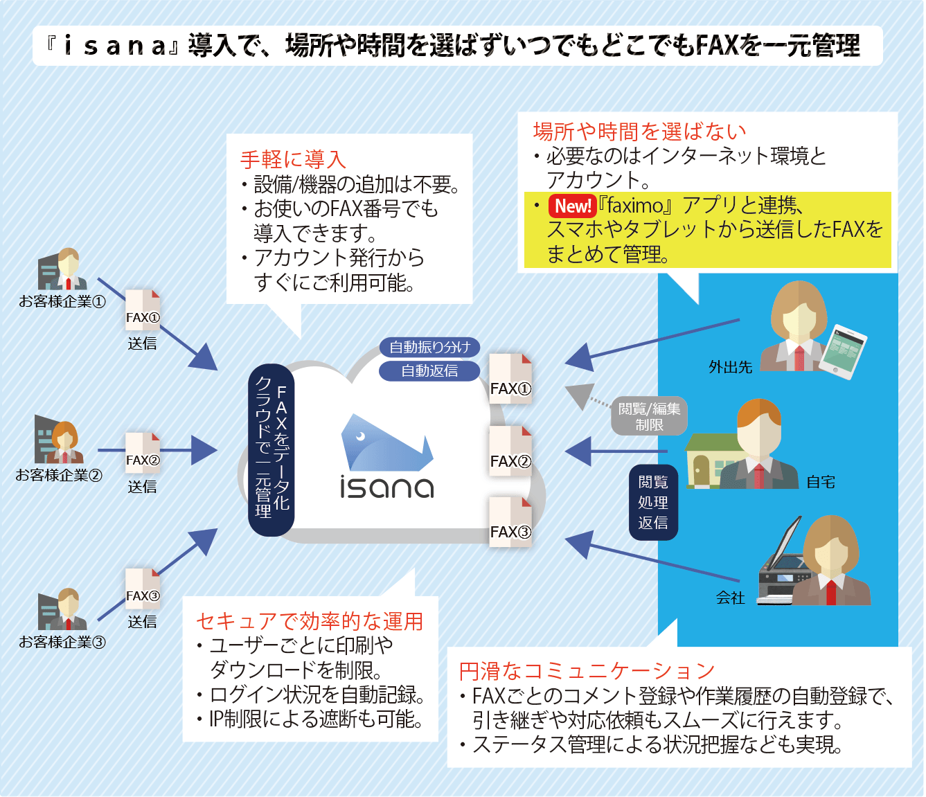 『isana』と『faximo』の連携機能を利用すれば、スマートフォン(スマホ)やタブレットから『faximo』アプリで送信したFAXを『isana』でまとめて管理可能となり、テレワークやBCP(事業継続計画)で求められる“オフィス以外の拠点からのFAX一元管理”が手軽に実現できます。