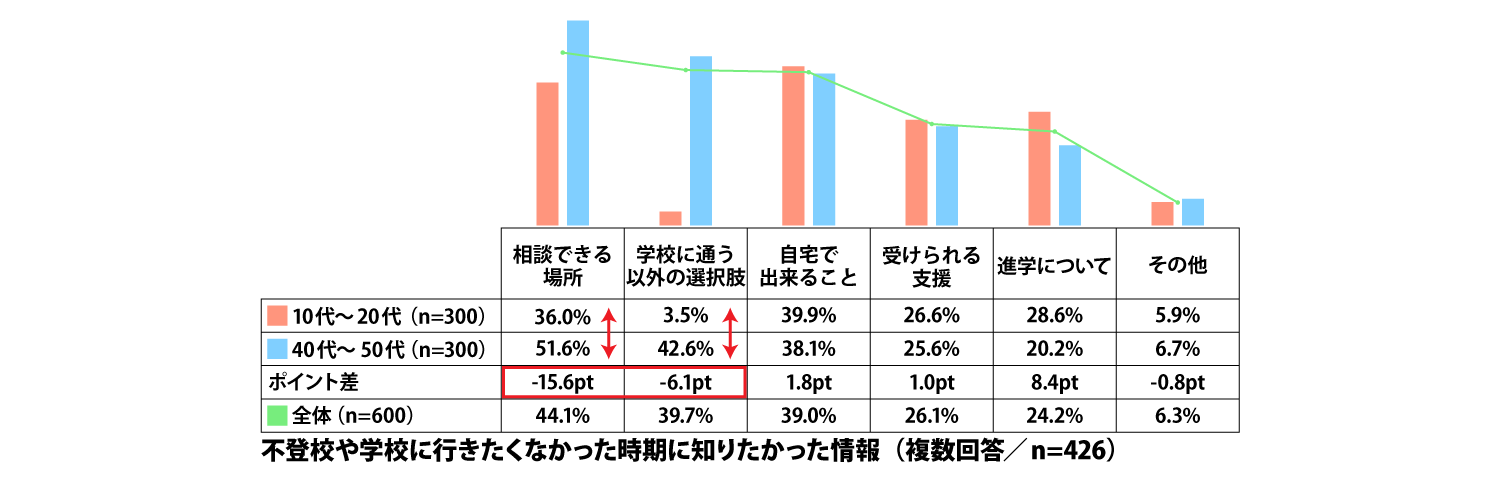 ●「相談できる場所」や「学校に通う以外の選択肢」を知りたかったとの回答が多く、とくに40代~50代が多く回答。「相談できる場所」は15.6ポイント、「学校に通う以外の選択肢」は6.1ポイントの差。