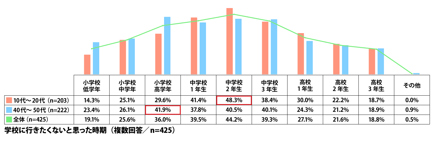 学校に行きたくないと思ったことがある人に対し、その時期をお聞きしました。最も多い回答は「中学2年生」となり44.2%が回答しています。年代別で比較をすると、10代~20代は「中学2年生」が最も多く48.3%、40~50代は「小学校高学年」が最も多く41.9%と年代で差のある結果となりました。