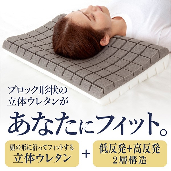 低反発が頭の形に合わせて沈み込み高反発で底つきが無いようにしっかり支えるため、寝返りが打ちやすくリラックスした体勢となることで翌朝のスッキリ感の違いを感じて頂けるよう素材と形状を工夫しました。上下で異なるウレタンを採用し低反発ウレタンで頭を優しく包み込み、高反発ウレタンで頭をしっかりと支えます。それぞれの特性を持つ贅沢な仕上がりの枕でお好みの硬さを選んで理想の寝姿勢を目指せる枕です。