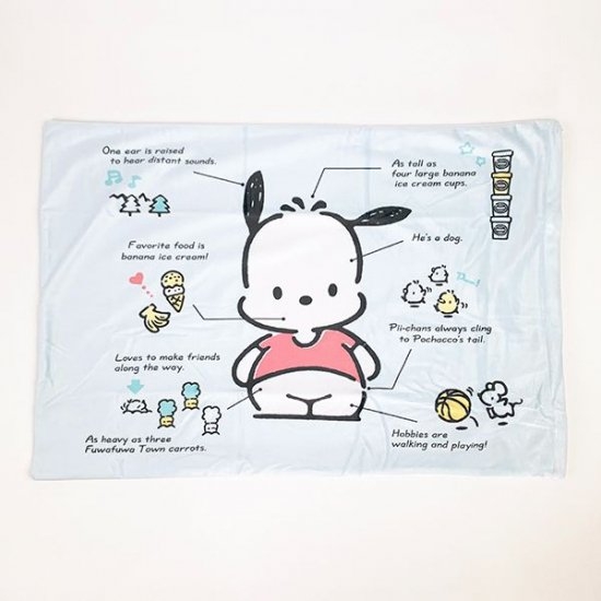 ポチャッコの周りには、アイスクリームや果物などいろんな要素が詰め込まれております。背景色が淡いブルーなので優しい印象のピロケース◎