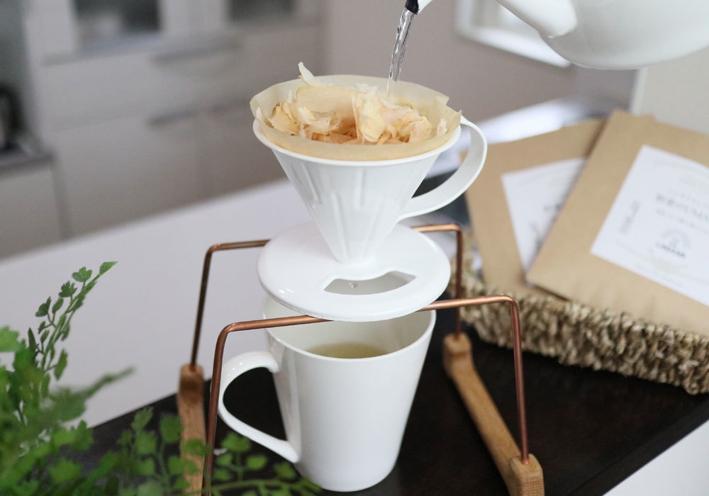 たまねぎ、にんじん、セロリ、じゃがいもの国産野菜をじっくりと時間をかけて乾燥させた乾燥野菜と、メジマグロの血合い部分を取り除いた花削り、スープ感覚で飲んでいただけるよう飲みやすく味付けした粉末がセットになっています。ドリッパーにフィルターをセットして、お湯をゆっくりと注ぐことで、やさしい味わいのおだしが抽出され、コトコト煮込んだ野菜スープのようなホッとする味をお楽しみいただけます。野菜本来のうまみ「グルタミン酸」とメジマグロ節のうまみ「イノシン酸」の相乗効果を活かした、香り高くやさしい味わいのだしです。飲むと懐かしさやほっとする瞬間を感じることができるよう、長年だしの製造で培った知見を活かし、だしのブレンドを行い開発しました。化学調味料・香料・着色料不使用、もちろんノンカフェインなので、コーヒーに代わるリラックスタイムのドリンクとしても注目を集めています。